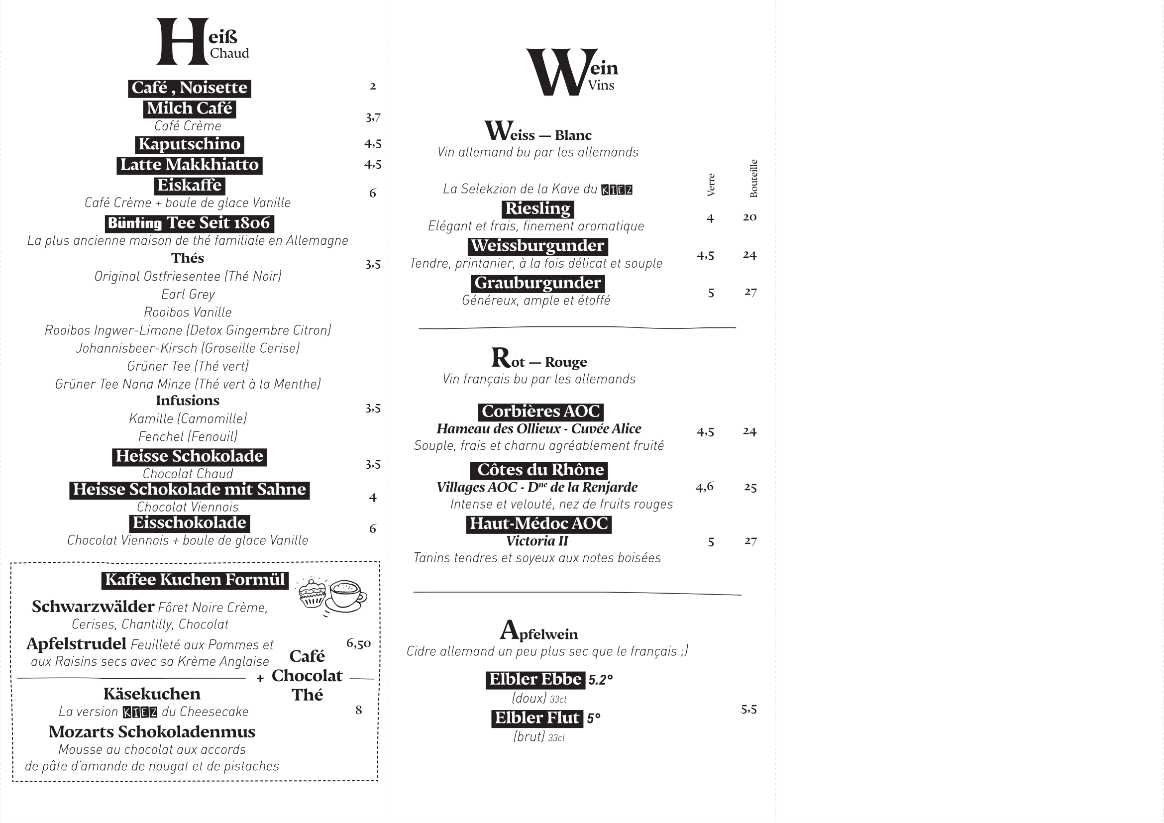 Bar allemand proposant des spécialités allemandes : schnitzel, käsespätzle, bretzel, currywurst, weisswurst, apfelstrudel, käsekuchen. Bières allemandes à la pression, en bouteilles, soft, cocktails, schnaps. Cadre cosy, en bois, bougies.