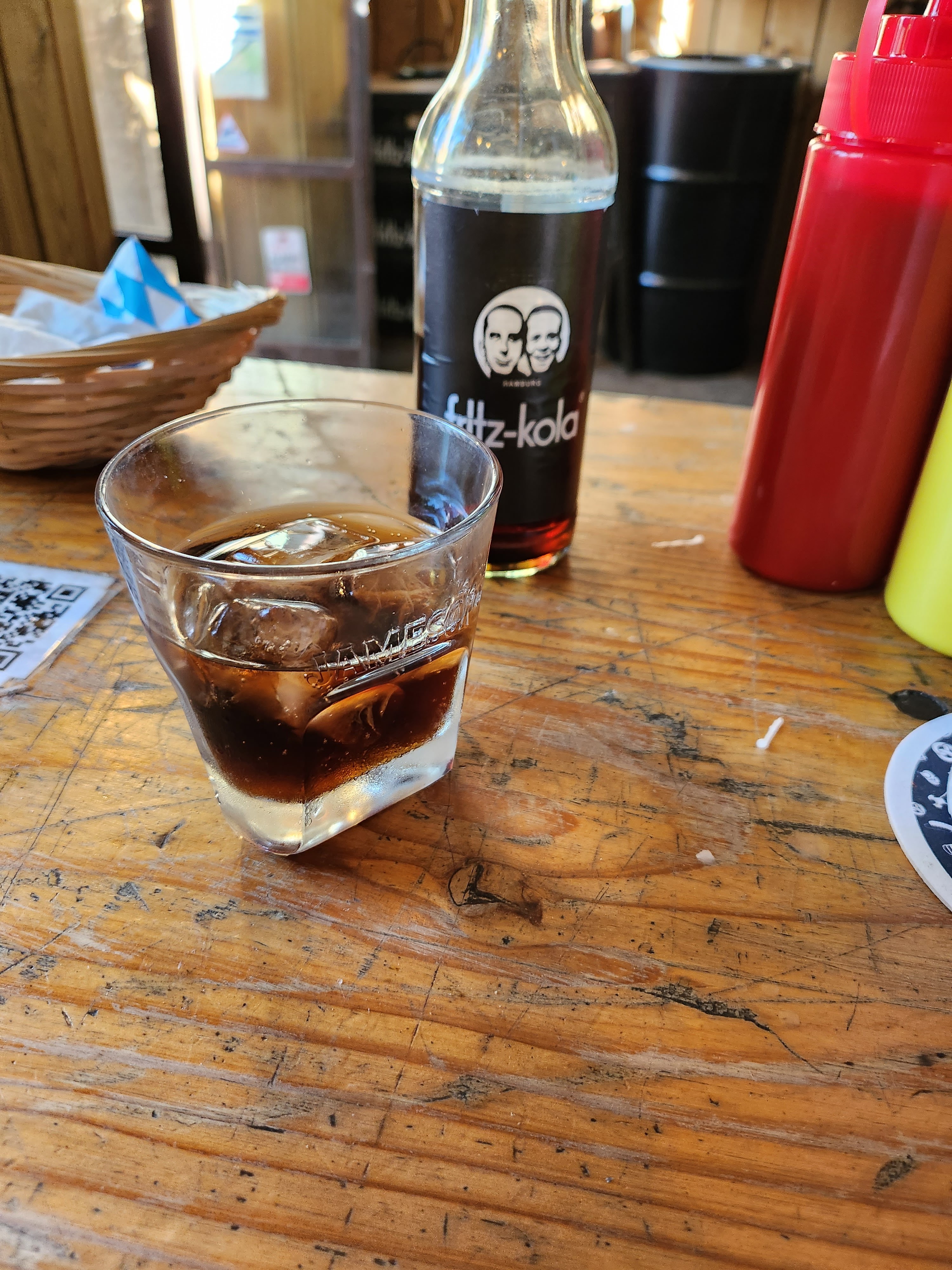 Des bretzels maison tout chauds ? Ah bah y en a qui ont de la chance ! Le nôtre était gratiné la veille, sans doute, et totalement froid. Sur une spécialité fromagère inoubliable, froide elle aussi, totalement insipide et bourrative. Quand à mon falafel, c'était une sorte de mixture molle de pois chiches (en boîte ?) écrasés à peine cuits. À peine tiède. Rien à voir avec le bon falafel grillé à cœur dont je me régale ailleurs. Pas pu finir. Seul points positifs : le pain du burger et les frites, excellentes. Et bonne bratwurst - mais rien à cuisiner de ce côté-là. Bref, une pause le long du Canal pour une bière et une saucisse-frites, pourquoi pas. Mais pas plus.