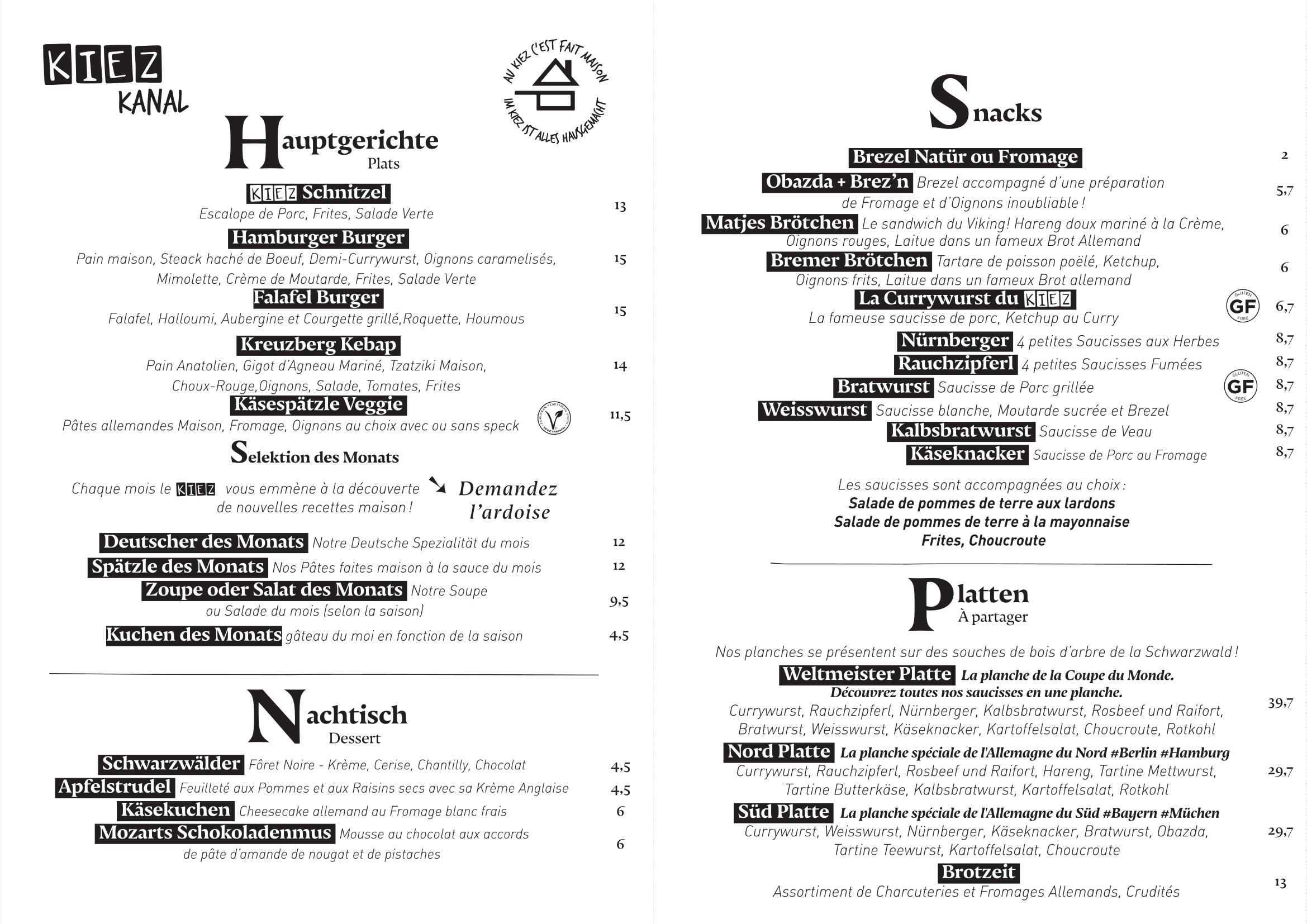 Il y a tellement peu de personnes qui associent plaisirs de la table et Allemagne, en France, que trouver une Gasthaus au bord du canal de l'Ourcq semble hautement improbable. Et pourtant Kiez Kanal existe bel et bien ! Les classiques sont de sortie, Currywurst, Wiener Schnitzel, Apfelstrudel, etc... Côté boissons, à la pression, le bière hambourgeoise Astra, ou le soda autrichien Almdudler, sans oublier une sélection des vignobles allemands. Bel endroit, belle ambiance et une carte fidèle et crédible.